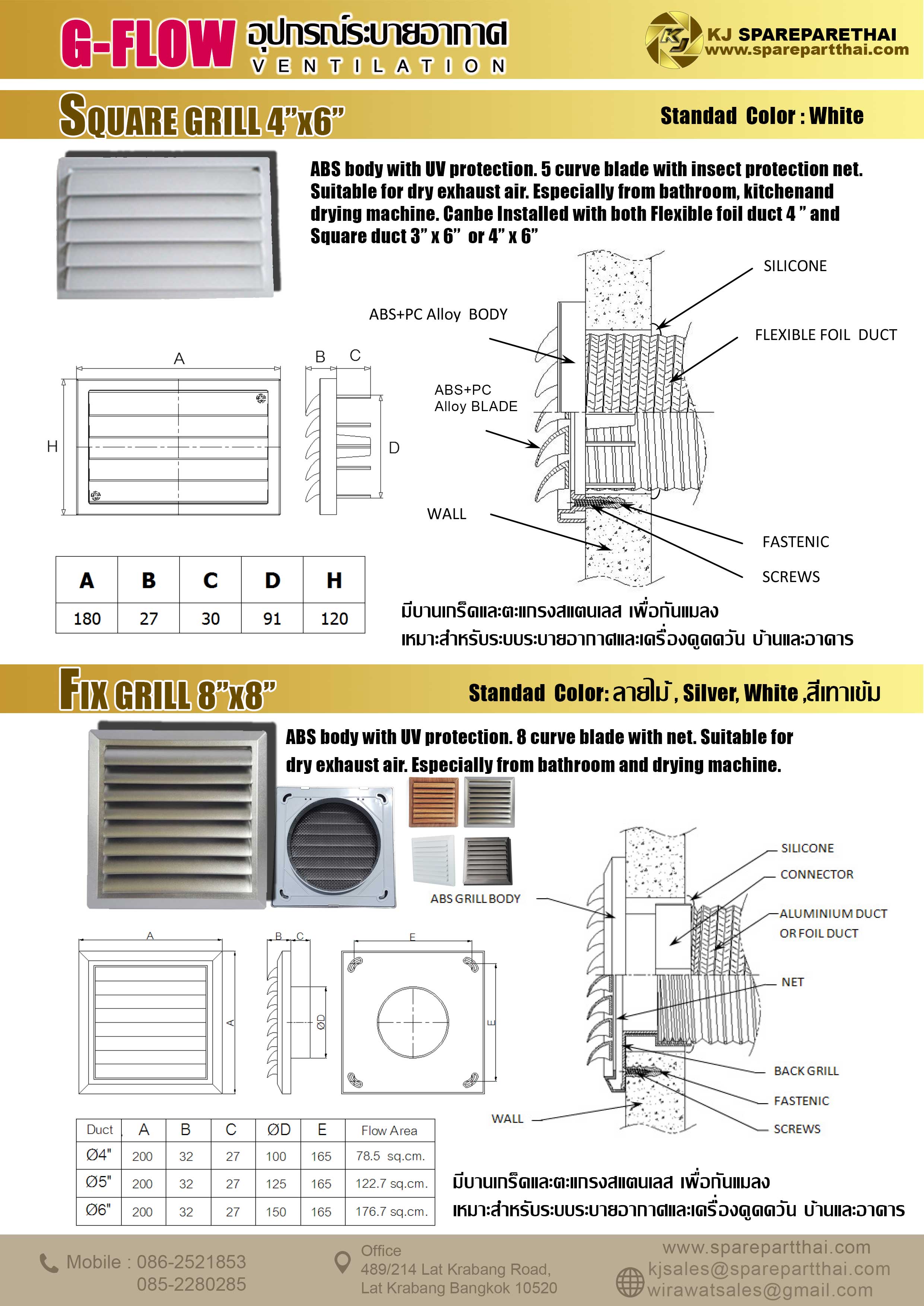 GFLOW หน้ากากระบายอากาศบานเกร็ด Fix Grill 8″x8″ ต่อท่อ 6″ (สีSilver)