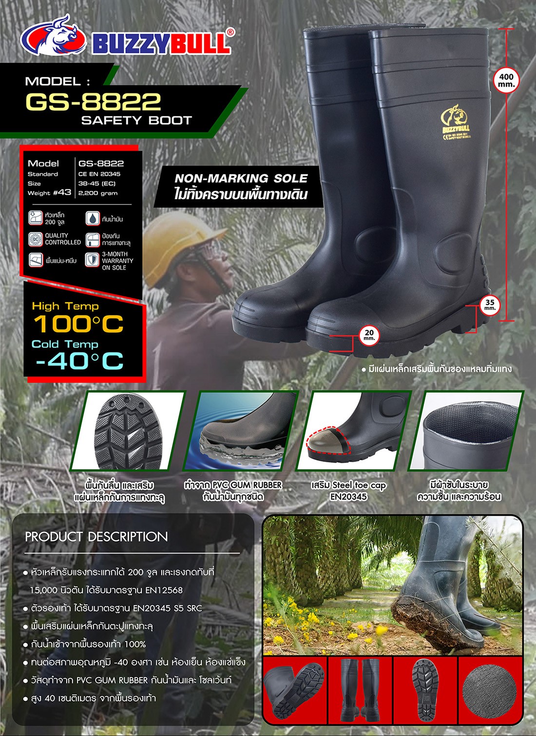 BUZZY BULL SAFETY BOOT GS-8822 รองเท้าบูทสูง 40cm หัวเหล็ก พื้นเหล็ก สีดำ