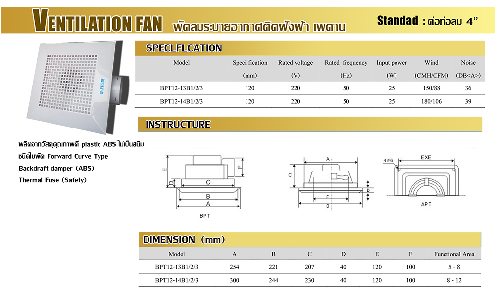 รายละเอียดสินค้า GFLOW พัดลมติดฝ้าเพดานห้องน้ำ ระบายอากาศ 6″ GFLOW รุ่น BPT12-13B2 สีขาว