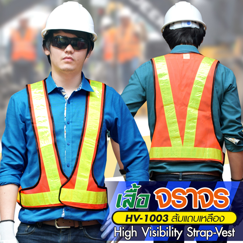 HV-1003 เสื้อจราจร สะท้อนแสง แบบสาย ผ้าส้ม แถบเหลือง