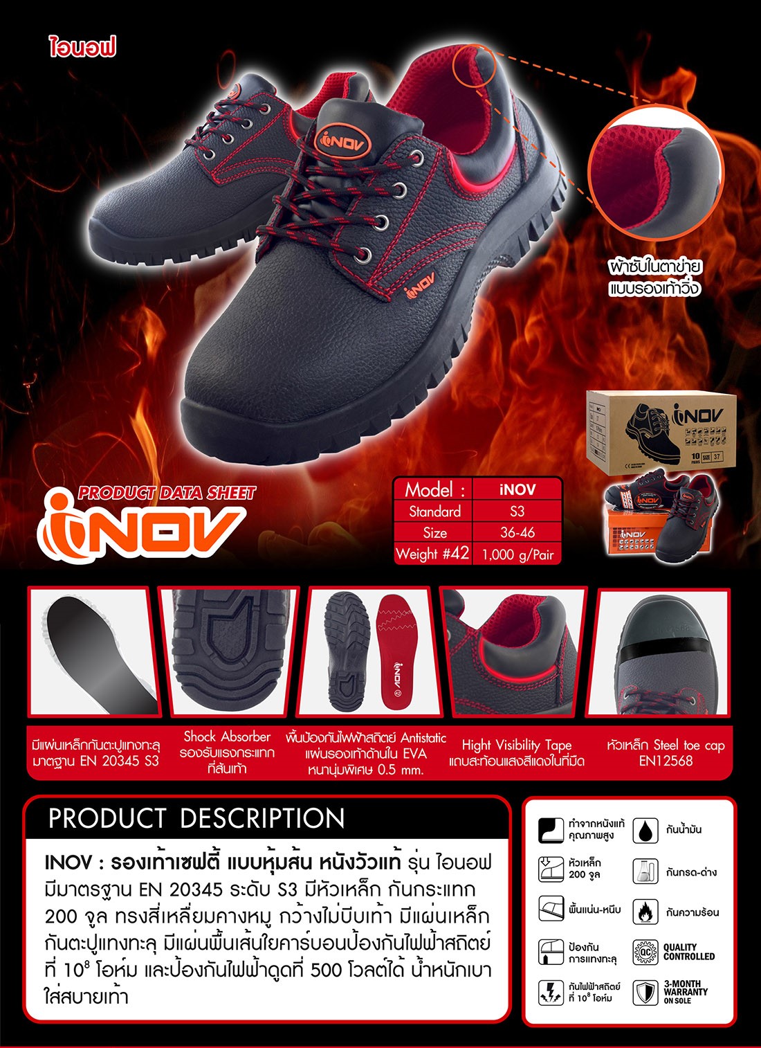 INOV รองเท้าเซฟตี้หุ้มส้น หนังวัวแท้ พื้นเส้นใยคาร์บอนป้องกันไฟฟ้าสถิตย์ พื้นเสริมเหล็ก