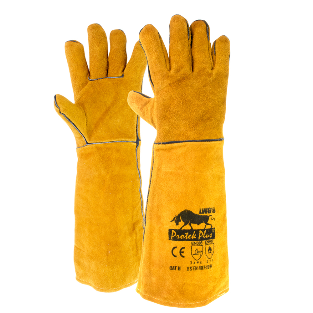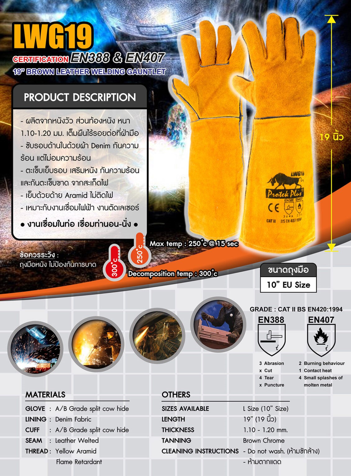 LWG19 | ถุงมือหนังงานเชื่อมไฟฟ้า ตัดเลเซอร์ สีน้ำตาลเหลือง Protek Plus