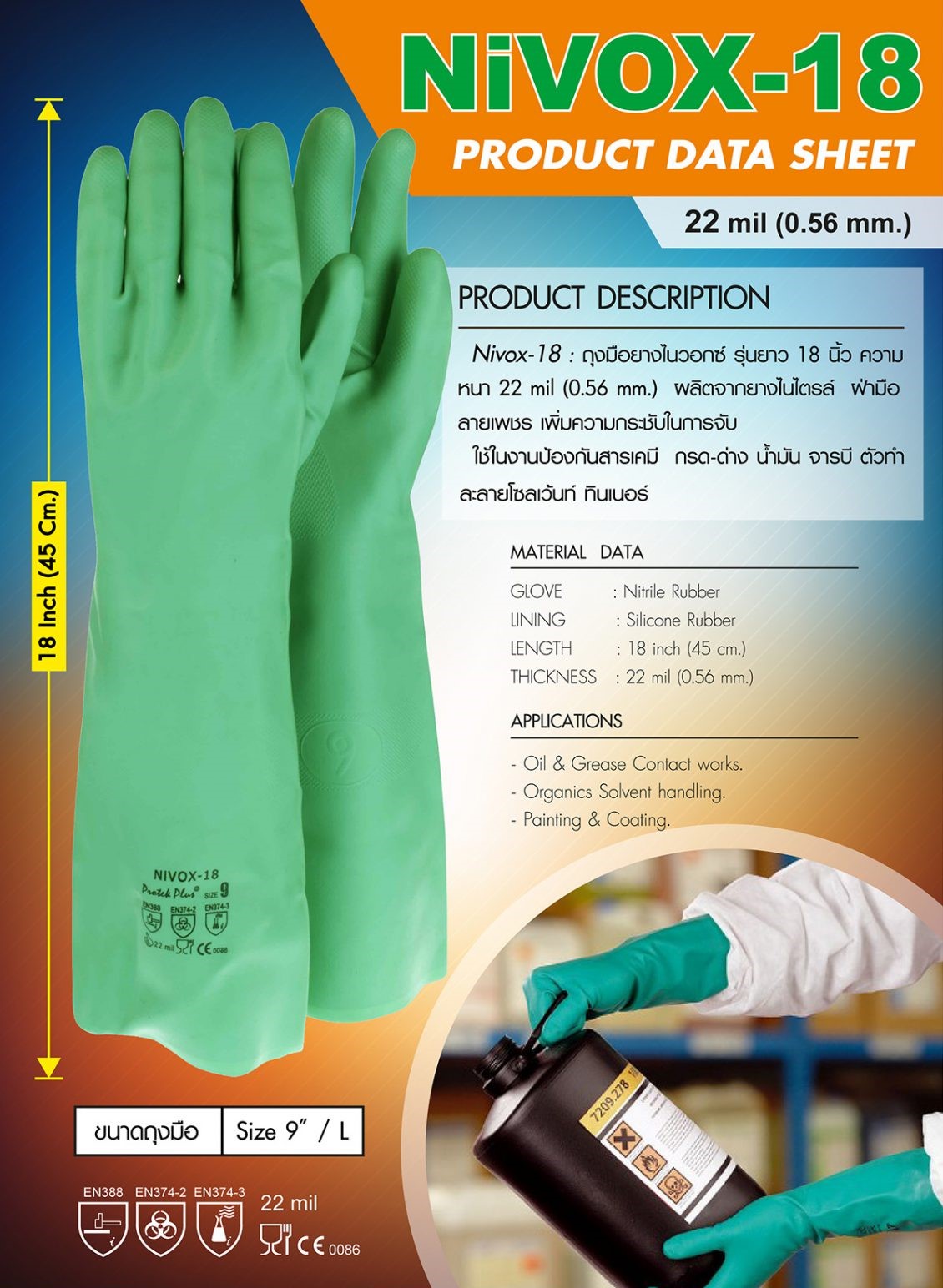 รายละเอียดของสินค้า NIVOX-18 INCHES : ถุงมือยางไนไตรล์เขียว ยาว 18 นิ้ว หนา 22 mil (0.56 มม.)