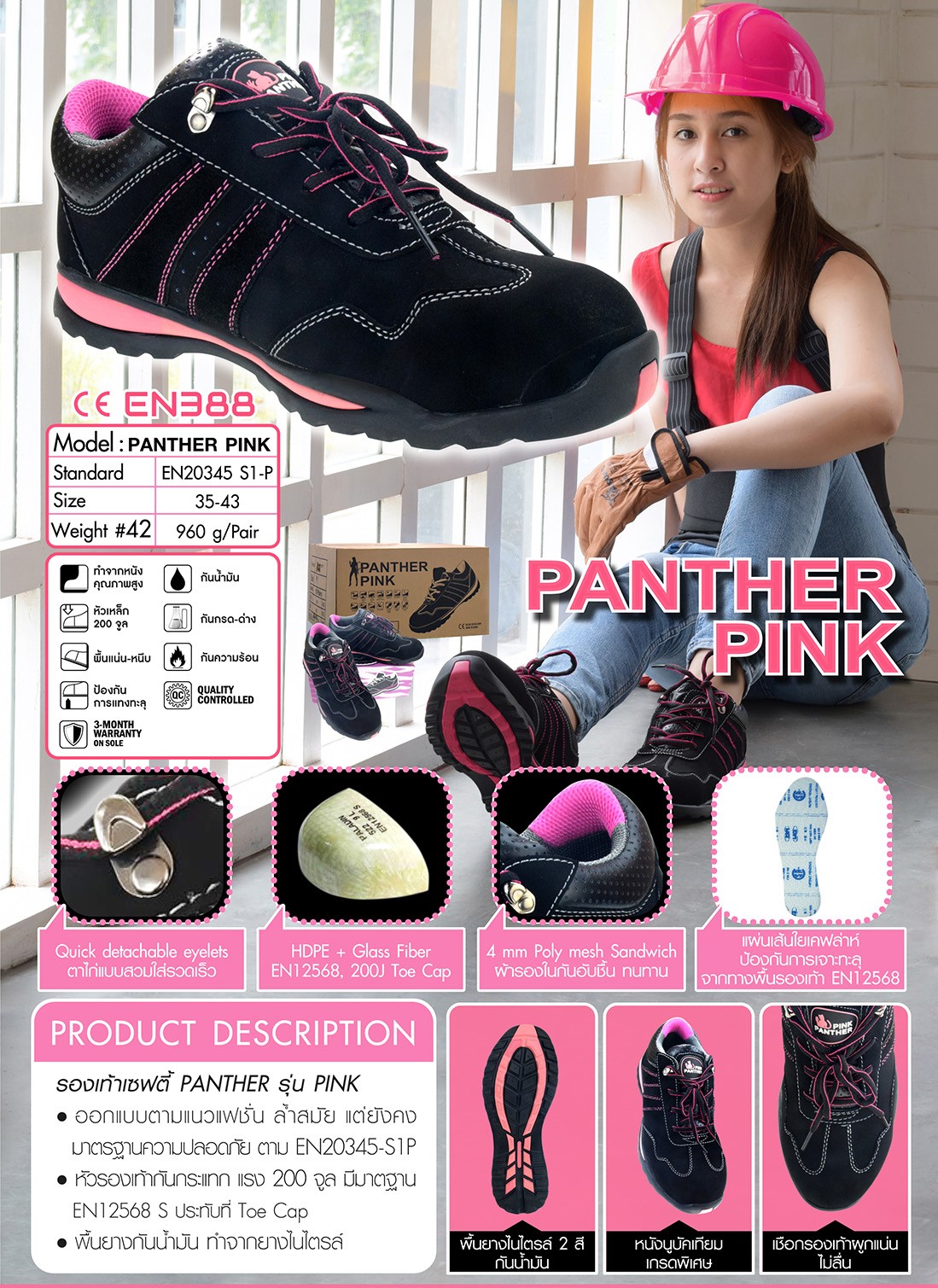 PANTHER PINK รองเท้าเซฟตี้ผู้หญิง น้ำหนักเบา ทรงสปอร์ต กันกระแทก200 จูล